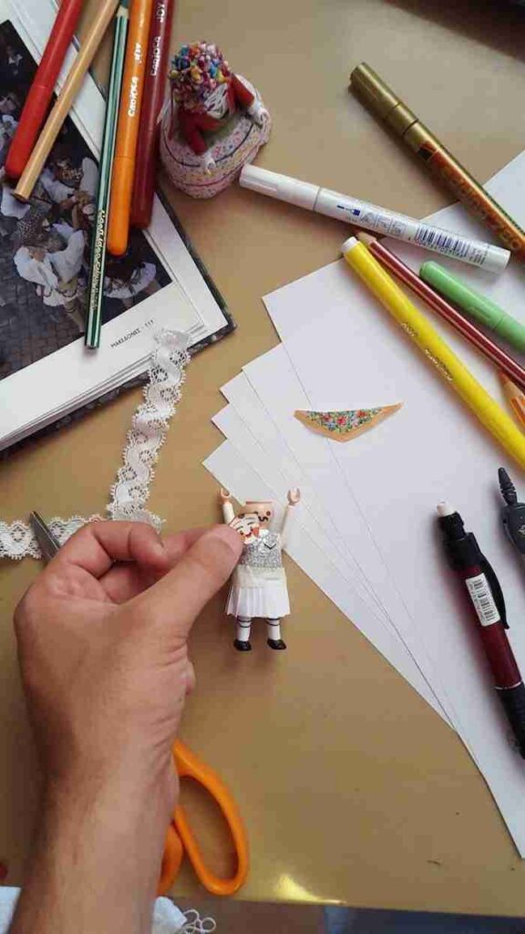 «Χρησιμοποιώ ό,τι υλικό μπορείς να φανταστείς ή, για να το πω πιο σωστά, σχεδόν τίποτα, ουσιαστικά δεν υπάρχουν συγκεκριμένα υλικά. Από χαρτοπετσέτες φτιάχνω τα μαντίλια τους, από χαρτί και χαρτονάκια τα ρούχα τους, μετά ζωγραφίζω τα παπούτσια τους, παίρνω ψεύτικα λουλουδάκια, κόβω πούλιες για τα κοσμήματά τους, τα κολλάω ένα ένα με τη μύτη του διαβήτη, δεν έχω καν ειδικά εργαλεία. Ό,τι υπάρχει στο σπίτι από υλικά και εργαλεία. Αγοράζω κάποια, αλλά περισσότερο εφευρίσκω τρόπους για να φτιάξω μια φορεσιά. Κόβω τα πατρόν, κοιτάζω να είναι σωστά τα ύψη και οι αναλογίες, τους τα κάνω πρόβα και μετά τα κολλάω. Η ζωγραφική των φορεσιών με τα μαρκαδοράκια έρχεται στο τέλος».