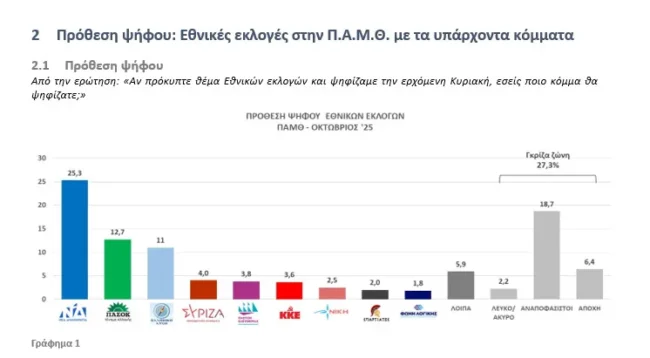Εάν είχαμε εκλογές αύριο η Ν.Δ. θα ήταν πρώτο κόμμα, με 25,3%. Τα μεγαλύτερα ποσοστά στις γυναίκες, στους ηλικιωμένους, με χαμηλή εκπαίδευση, στη Καβάλα και στη Ροδόπη, στους ελευθέρους επαγγελματίες και στους συνταξιούχους, καθώς και σε όσους αυτοποθετούνται στην «δεξιά» και την «κέντρο – δεξιά».
