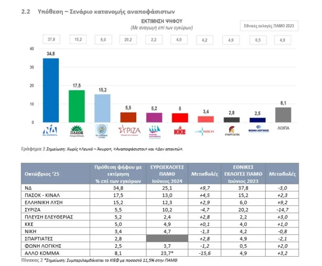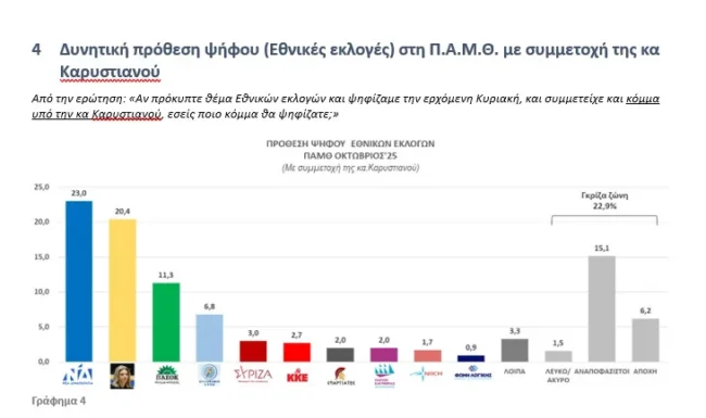 Σε ένα σύνθετο σενάριο, όπου Τσίπρας, Καρυστιανού και Σαμαράς κατέρχονται ταυτόχρονα, το πολιτικό τοπίο ανατρέπεται, με τη ΝΔ να παραμένει πρώτη αλλά χωρίς «ζώνη ασφαλείας». Το κοινωνικό και ιδεολογικό σώμα δείχνει να ενεργοποιείται εκ νέου, αναζητώντας πρόσωπα και προτάσεις με νέα δυναμική.