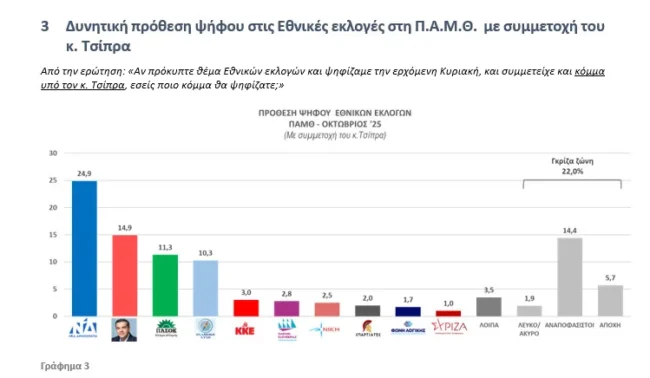 Η δημοσκόπηση συμπεριλαμβάνει (είχε προηγηθεί) την παραίτηση του Α. Τσίπρα από την θέση του βουλευτή του ΣΥΡΙΖΑ. Στην δυνητική περίπτωση που ο κ. Τσίπρας κατερχόταν στις εκλογές ως επικεφαλής κόμματος, δηλώνει ότι θα τον ψήφιζε το 14,9%. Το αντίστοιχο ποσοστό σε έρευνα που πραγματοποιήθηκε στην ΠΔΕ (την περίοδο προ της παραίτησης και συγκεκριμένα 17/9-26/9/2025) ήταν 13,4%.