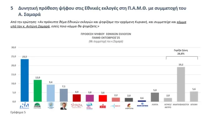 Ο Αντώνης Σαμαράς, σε δικό του υποθετικό κόμμα, συγκεντρώνει μικρότερο αλλά υπαρκτό ποσοστό, κυρίως από τον δεξιό χώρο, επιβεβαιώνοντας τον πολυκερματισμό της συντηρητικής παράταξης. Παρά τη διατήρηση του προβαδίσματος της ΝΔ, τέτοιες διαρροές ενδέχεται να επηρεάσουν τη μελλοντική εκλογική της ισχύ.